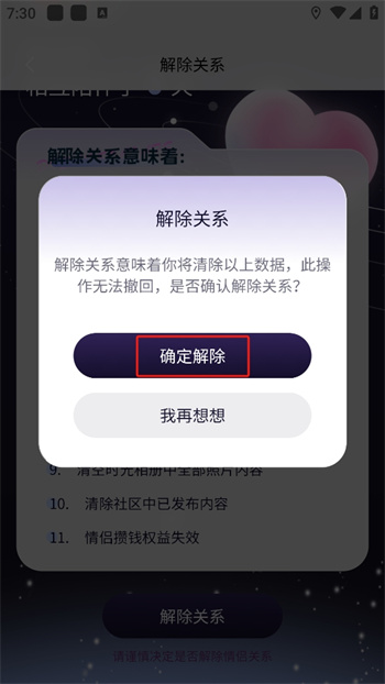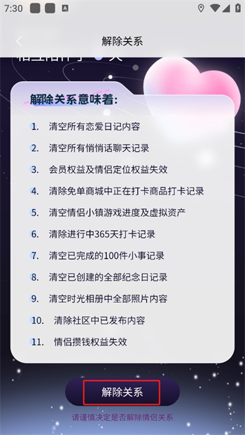 5、确认解除关系之后意味着的各个选项,紧接着往下方划去就会看到一个【解除关系】的按键;