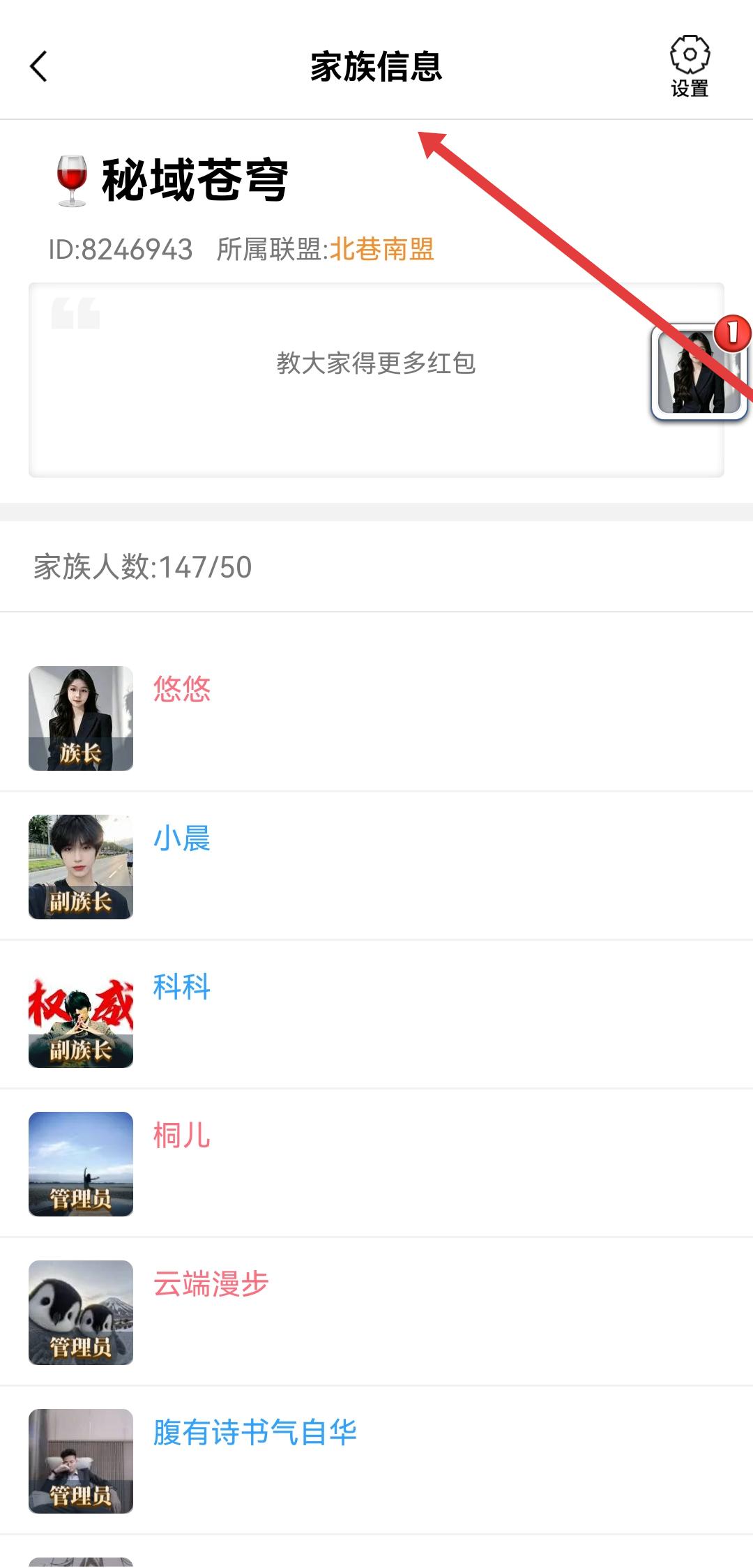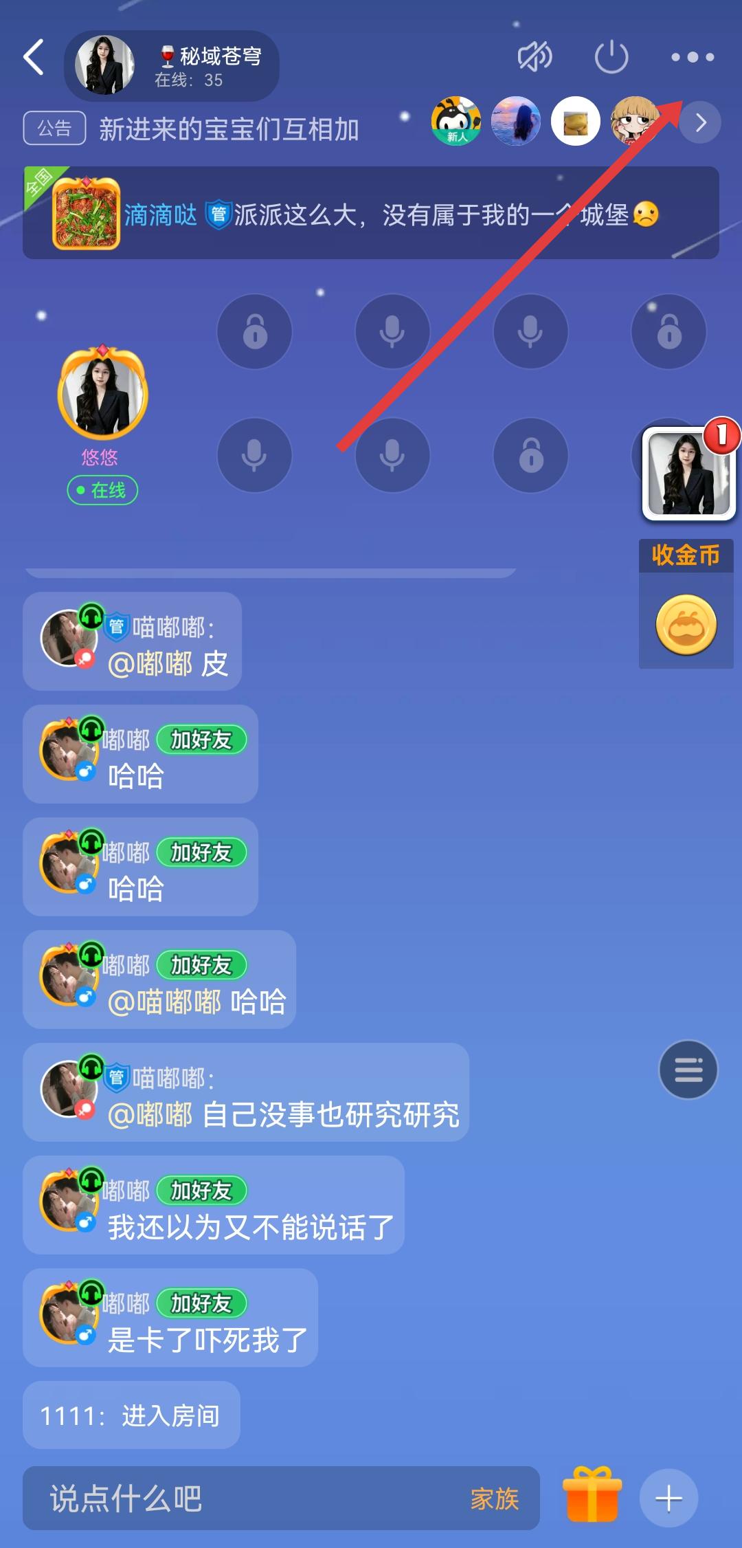 3、进入家族聊天界面后,点击右上角的三点图标,进入家族信息页面。