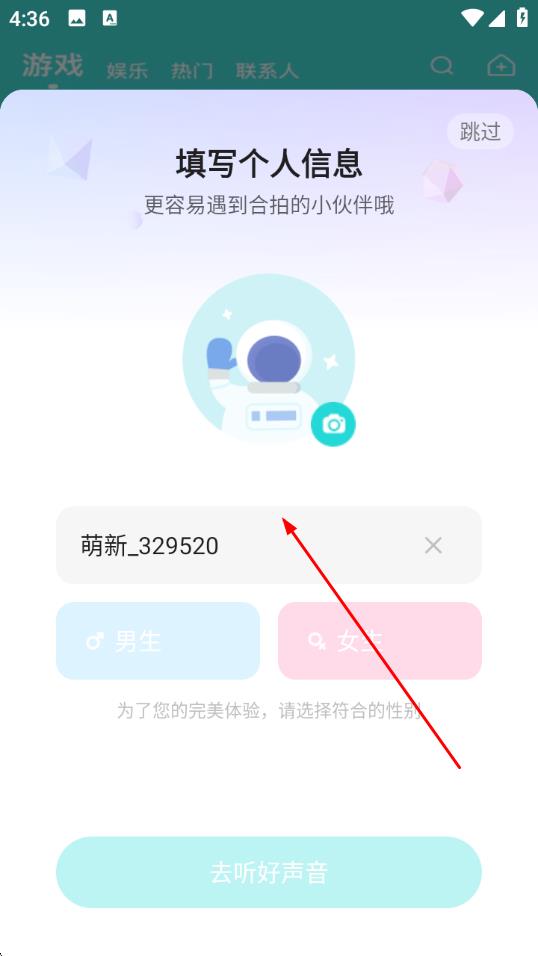 3、登录成功后,进入填写个人信息页面,设置昵称,选择性别,点击去听好声音,完善个人信息并进入应用功能使用环节。