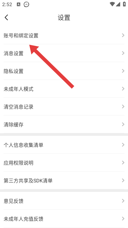 2、在设置界面中,点击账号和绑定设置选项,进入账号绑定相关页面。
