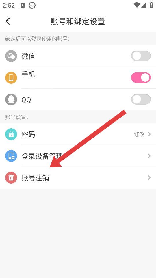 3、在账号和绑定设置页面,点击账号注销选项,进入账号注销选择界面。