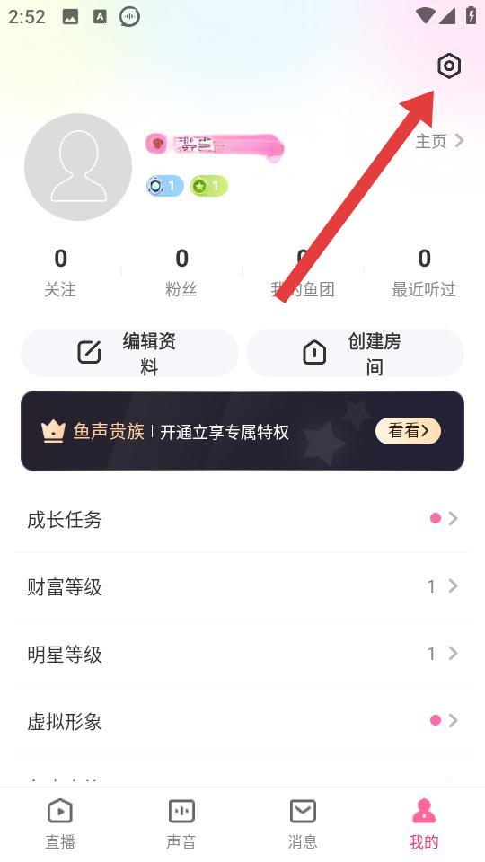 1、打开鱼声APP我的页面,点击右上角设置图标,进入设置界面。