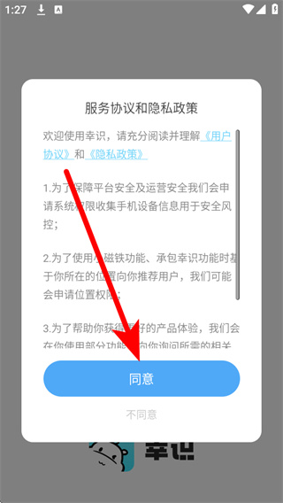 1、打开幸识,在弹窗中点击同意,进入应用的欢迎界面。