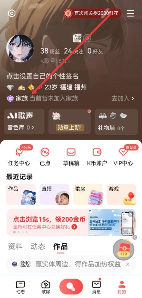 1、打开全民K歌后,进入我的页面,点击家族的选项,进入家族广场的界面。