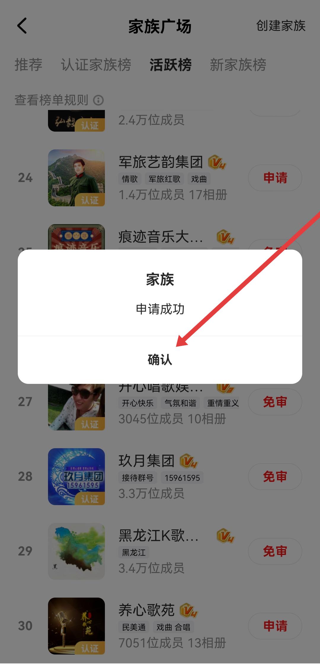 3、点击目标家族旁的免审或申请按钮,在弹出申请成功提示框后,点击确认等待家族审核或直接加入。