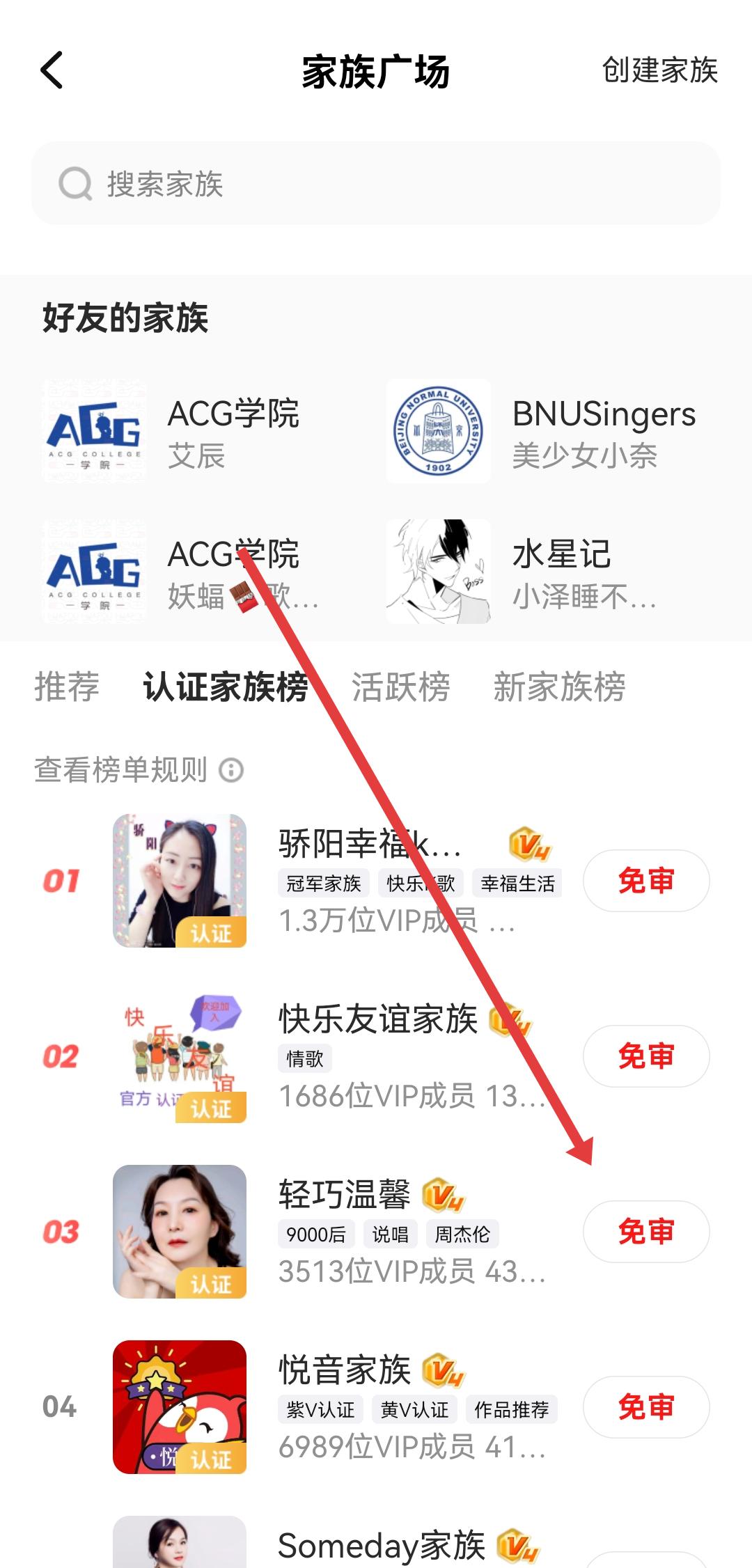 2、在家族广场中,浏览推荐、认证家族榜、活跃榜等榜单,找到心仪且带有免审或申请标识的家族。