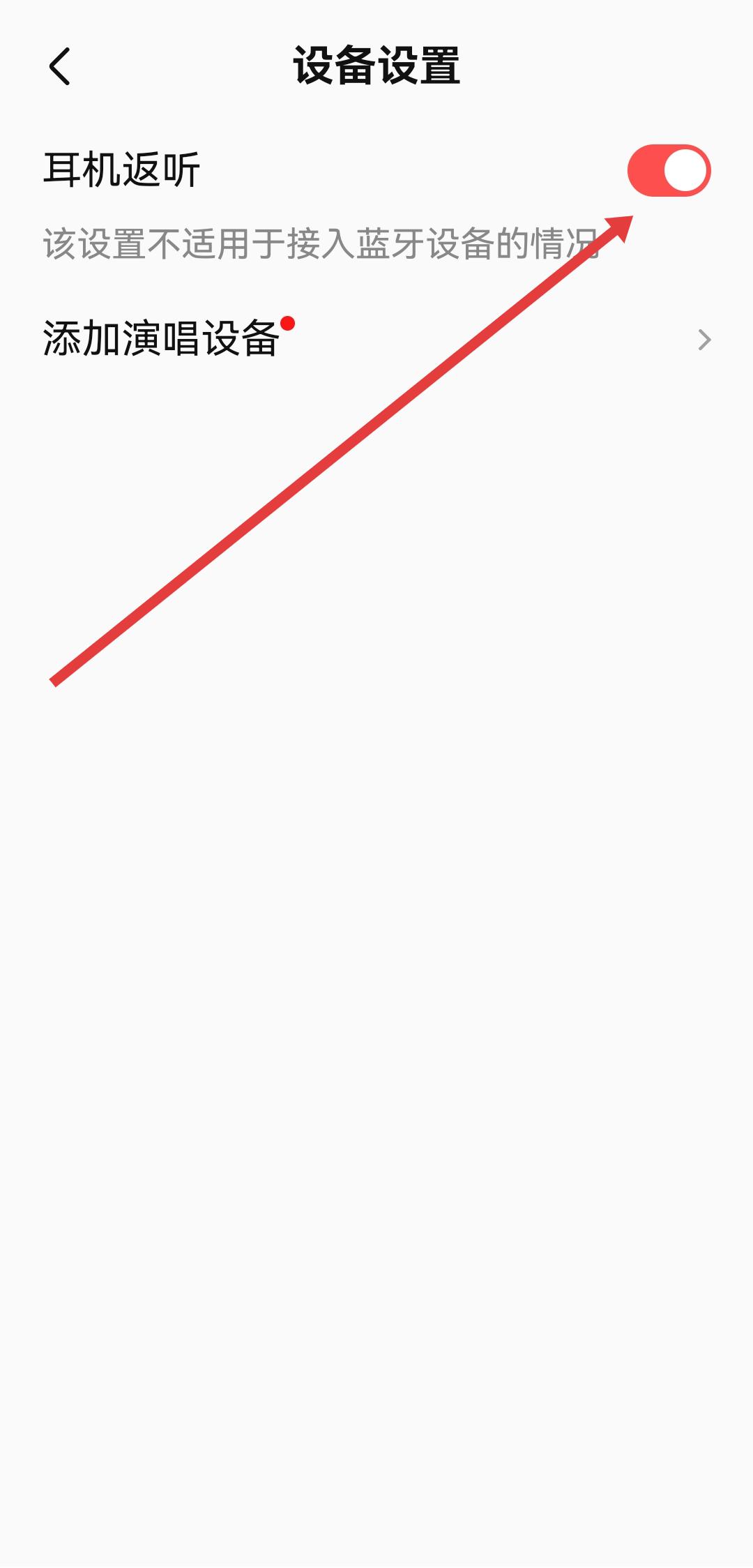 3、在设备设置页面里,点击耳机返听右侧的红色开关按钮,将其关闭,即可关闭耳返功能。