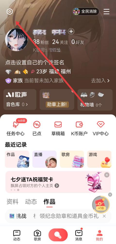 1、进入全民K歌我的页面,点击左上角的设置图标,进入到设置的界面。