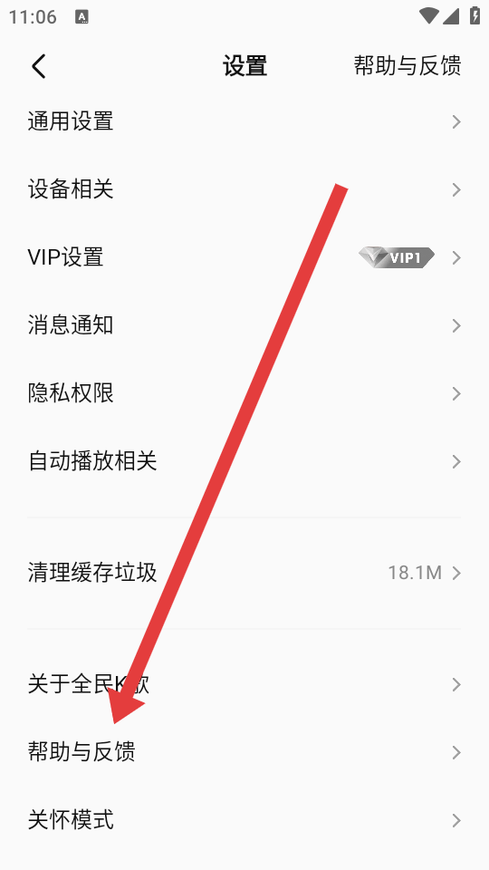 1、进入全民K歌设置页面后,需要点击帮助与反馈,进入帮助与反馈界面。