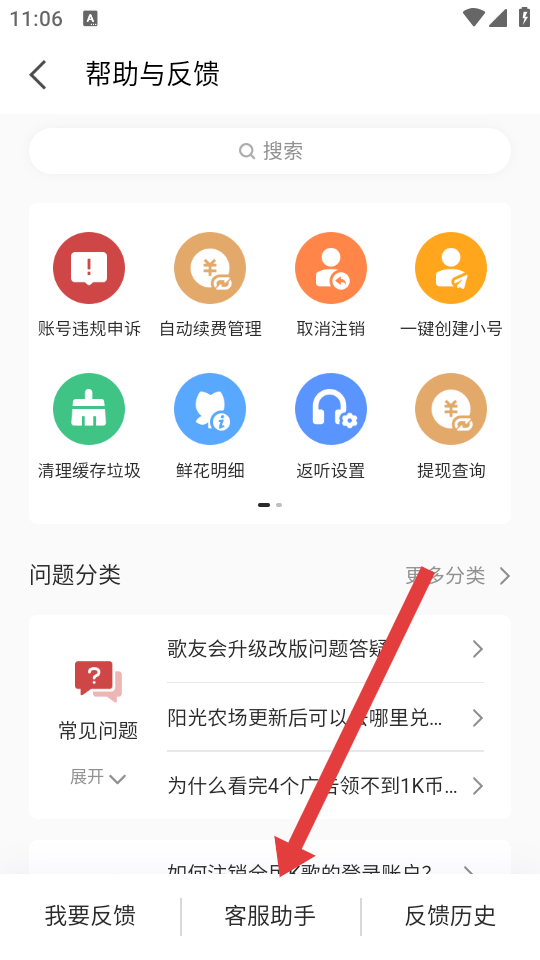 2、在帮助与反馈页面中,点击底部的客服助手,进入客服咨询的界面。