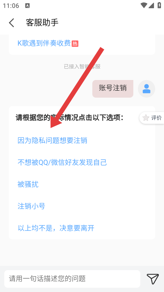 3、在客服助手页面里,输入账号注销并发送,然后根据实际情况选择注销原因,按提示完成账号注销流程。