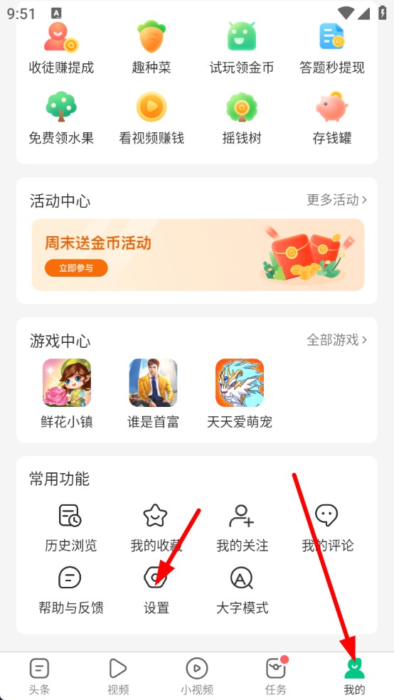1、打开趣头条APP,进入底部导航栏我的,点击设置。