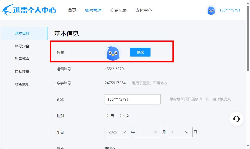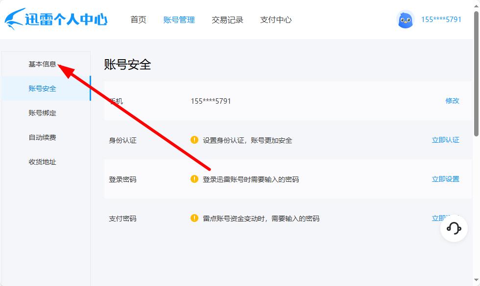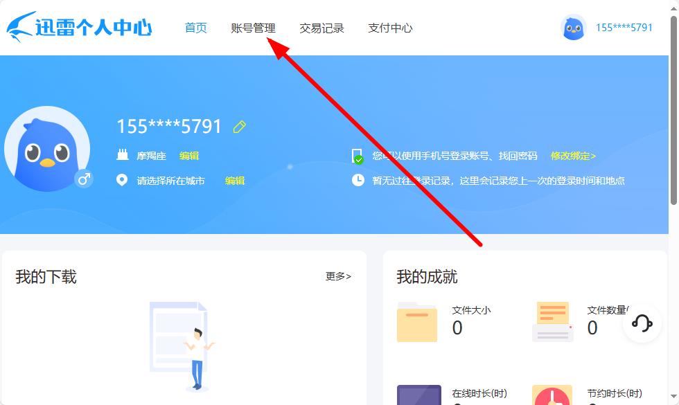 1、打开迅雷影音并登录账号,进入迅雷个人中心,点击上方账号管理选项。