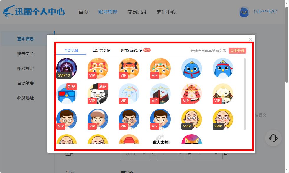 4、在弹出的选择头像界面,可以从全部头像、自定义头像、迅雷藏品头像等类别里挑选喜欢的头像,确认选择后即可完成头像更改。