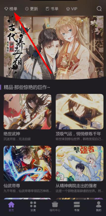 1、打开漫画岛APP进入首页,点击首页上方导航栏中的榜单选项,进入本月热门排行页面。