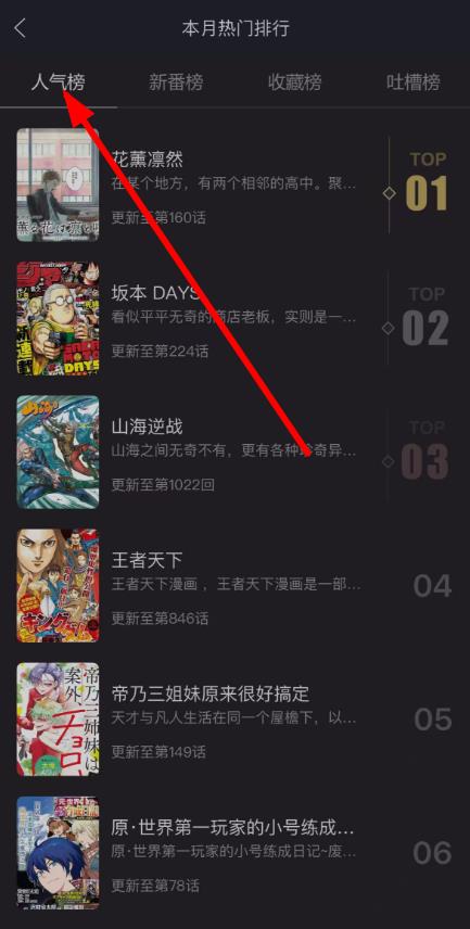 2、在本月热门排行页面,默认显示的就是人气榜,你可以浏览榜单上漫画的排名、名称、更新话数等信息。