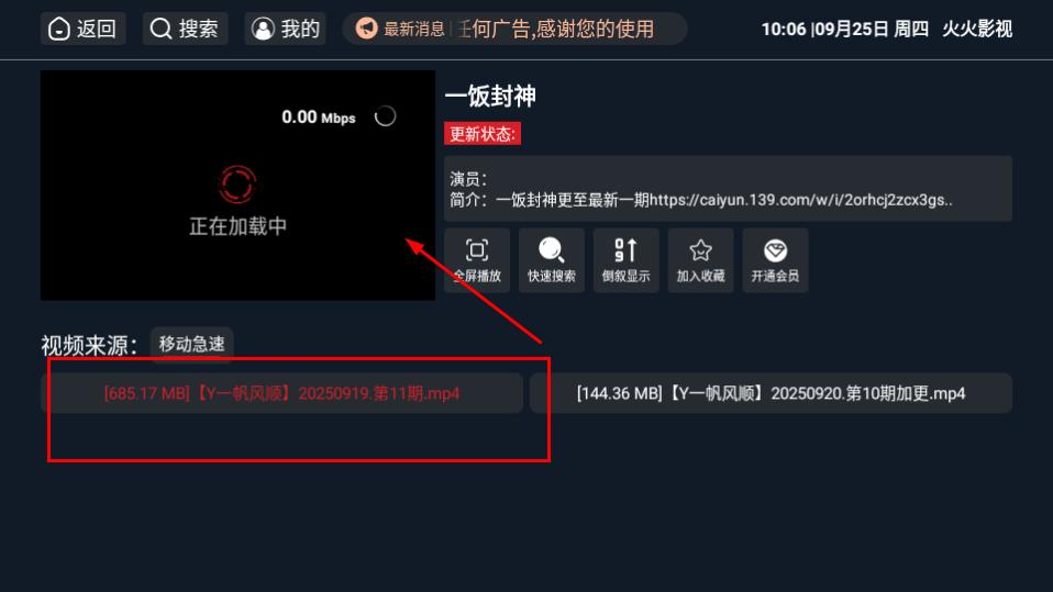 3、在搜索结果页面,选择一饭封神的播放源,进入节目播放页面。