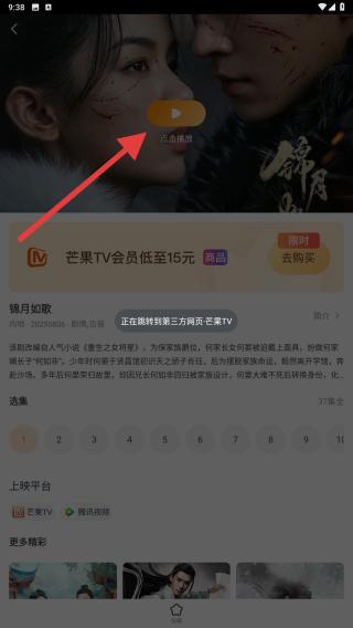 1、通过搜索/浏览找到目标影片,进入剧集详情页,点击播放触发跳转第三方网页的提示,过程无需操作可自动跳转。