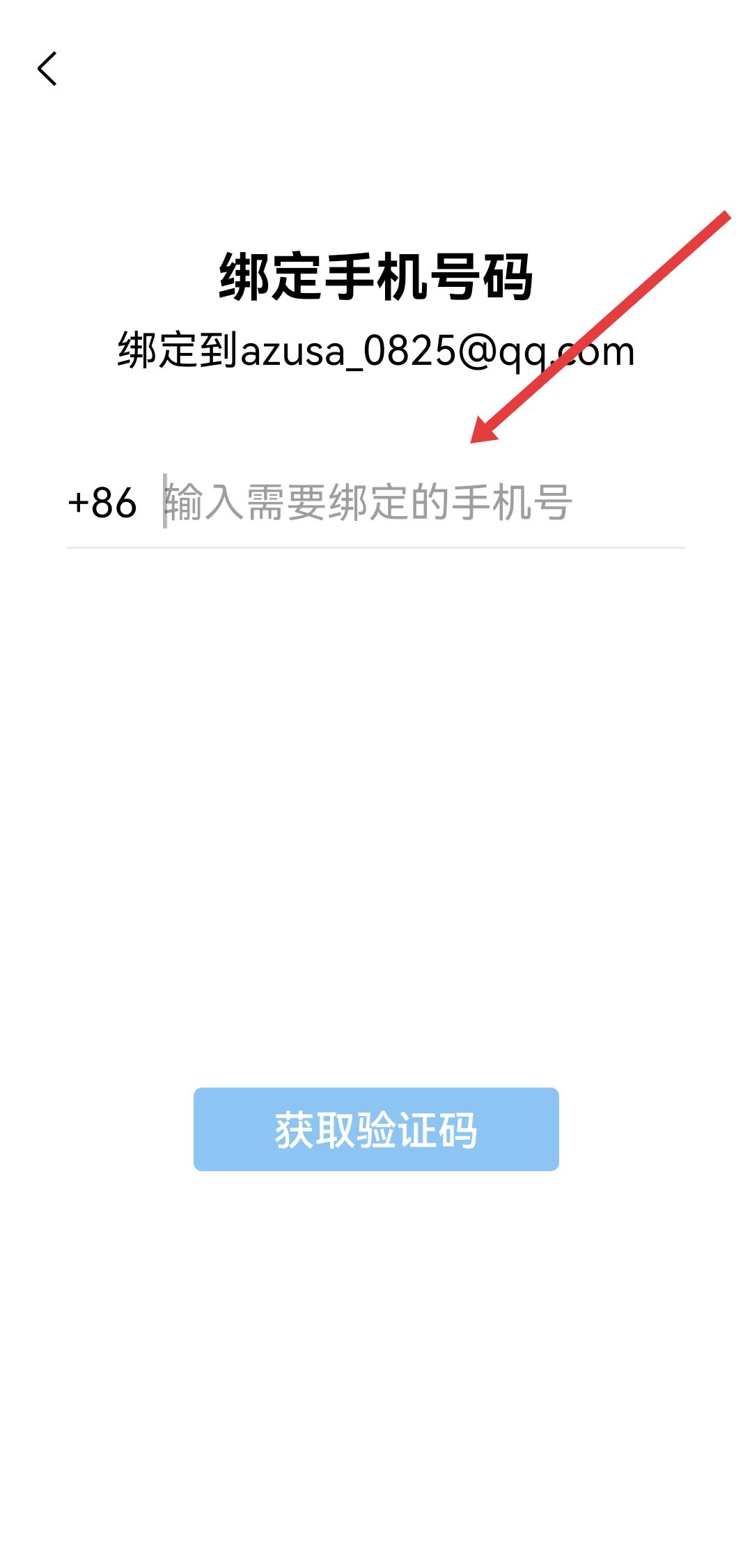 3、进入绑定手机号码页面,在+86输入需要绑定的手机号输入框中填写手机号,然后点击获取验证码完成验证,以便继续完成注册。