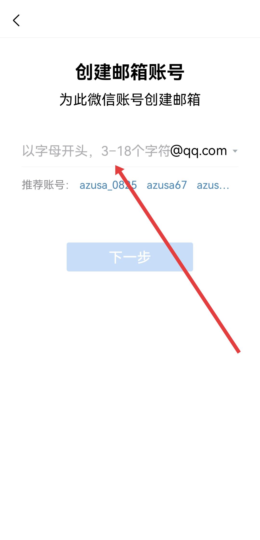 2、在创建邮箱账号页面,输入以字母开头,3-18个字符@qq.com格式的邮箱账号,可参考推荐账号,输入完成后点击下一步。