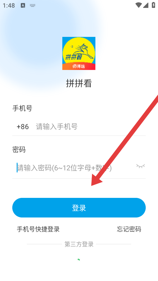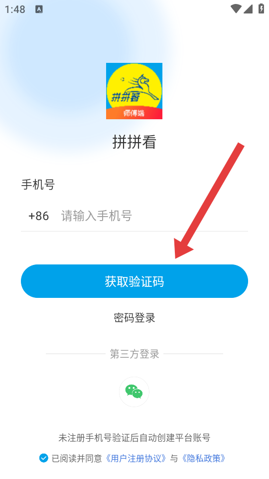 1、在拼拼看师傅端app登录页页输入手机号,点击获取验证码,以短信验证方式启动登录流程。