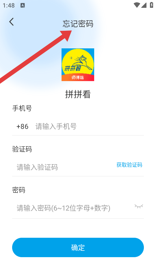 3、进入忘记密码的界页,填写手机号、验证码,设6~12位字母+数字的新密码,点击确定重置密码。