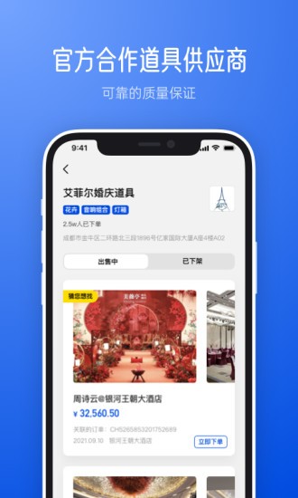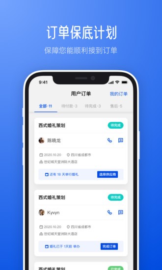 橙婚职业人软件手机版适合婚礼职业人来使用,支持在手机上查看最新的订单情况,可以根据婚礼的要求在线采购相关的婚庆道具,可以根据每个客户的订单时间来进行档期管理,欢迎感兴趣的朋友下载使用!