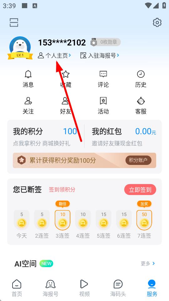 2、在服务页面中,点击头像旁边的个人主页选项进入个人主页界面。