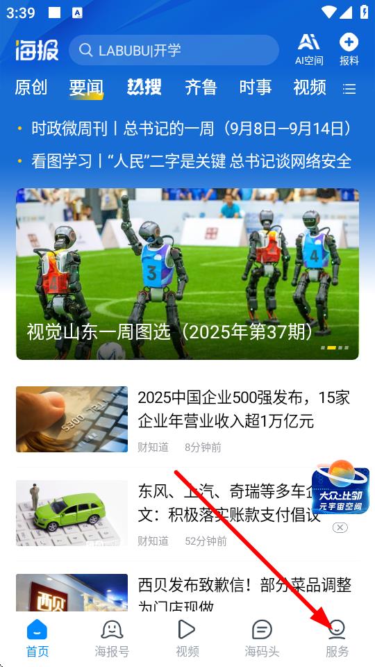 1、打开海报新闻app,点击底部导航栏最右侧的服务进入相关页面。