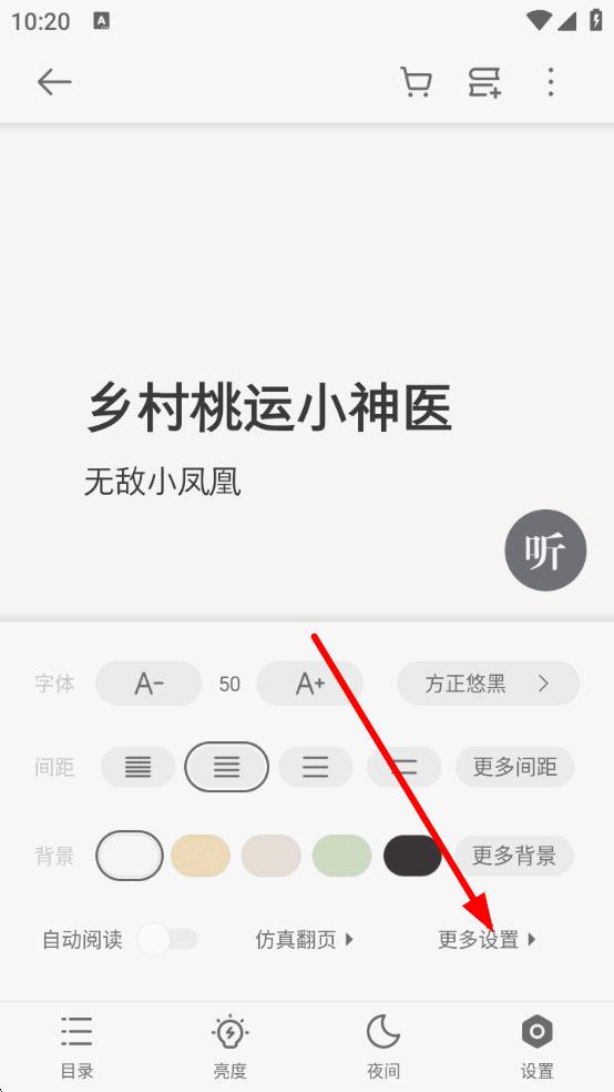 2、在设置菜单里,点击更多设置选项进入更详细的阅读设置页面。