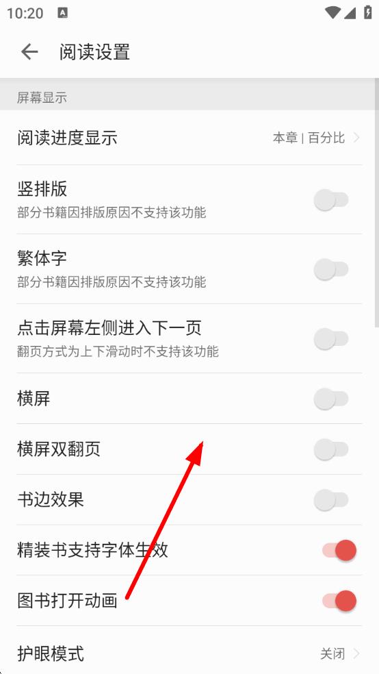 3、在阅读设置页面中,找到横屏选项,点击开启该选项即可旋转屏幕进行横屏阅读。