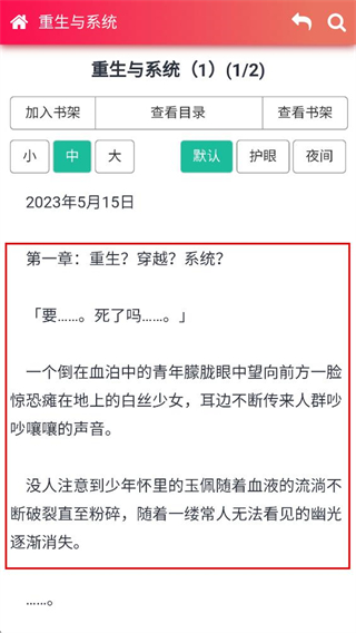 4、在阅读界面,可调整字体大小、切换阅读模式,阅读该小说的章节内容。