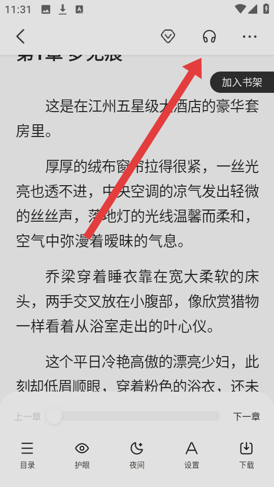 2、打开工具栏后,需要点击右上角顶部工具栏中的耳机图标,先进入听书的模式设置界面。
