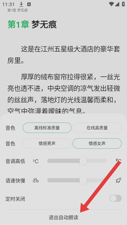 3、在听书设置的界面里,这边找到并点击退出自动朗读的按钮,这样就可以退出听书的模式。