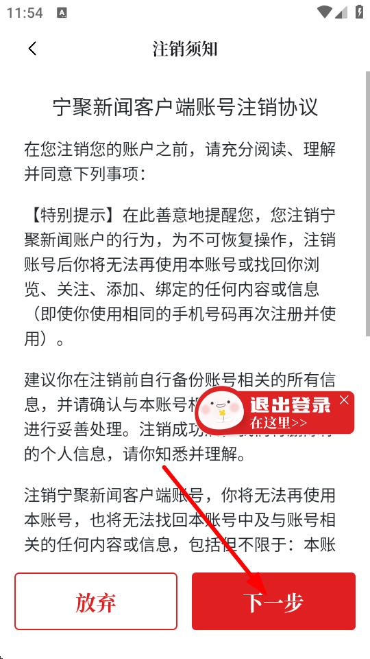 4、在注销须知页面,确认后点击下一步,按照后续提示完成账号注销操作。