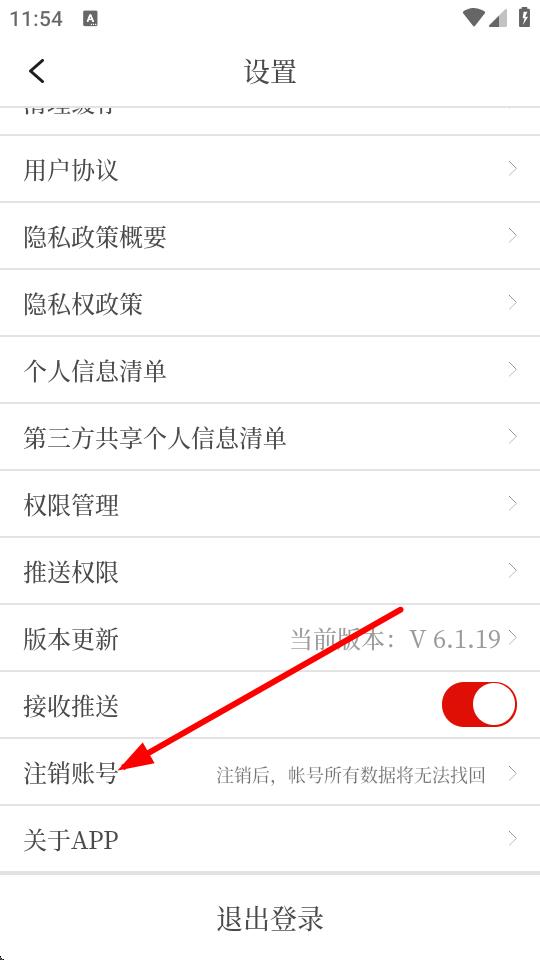 3、在设置界面里,点击注销账号选项,进入注销须知页面。