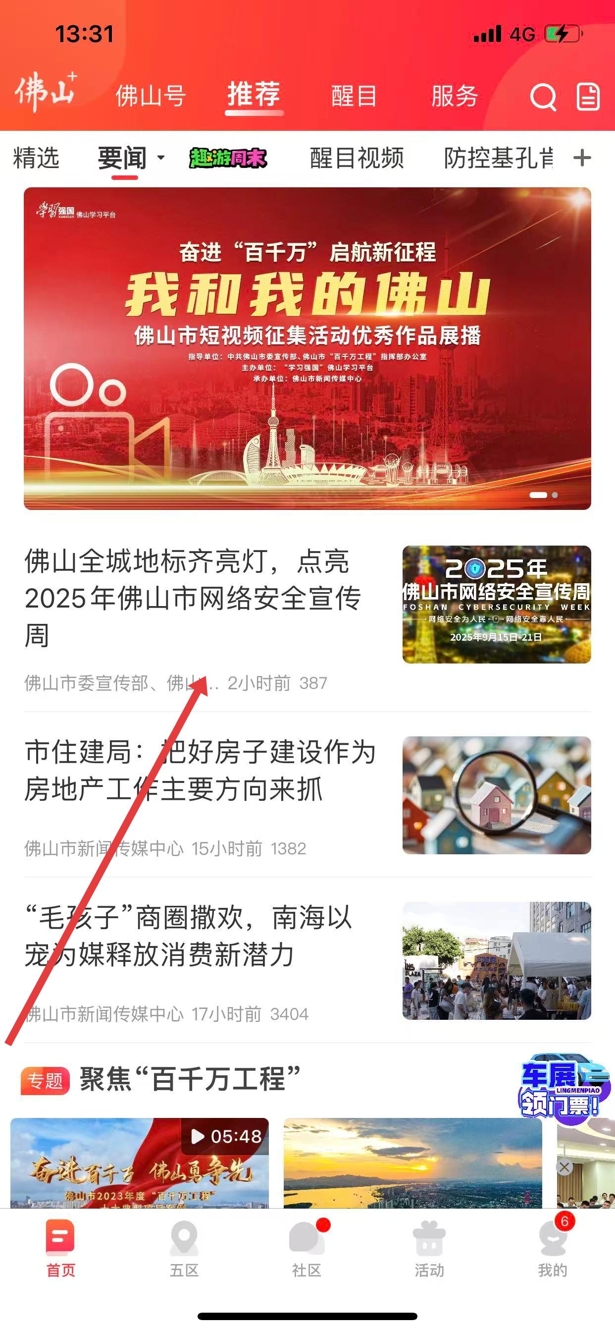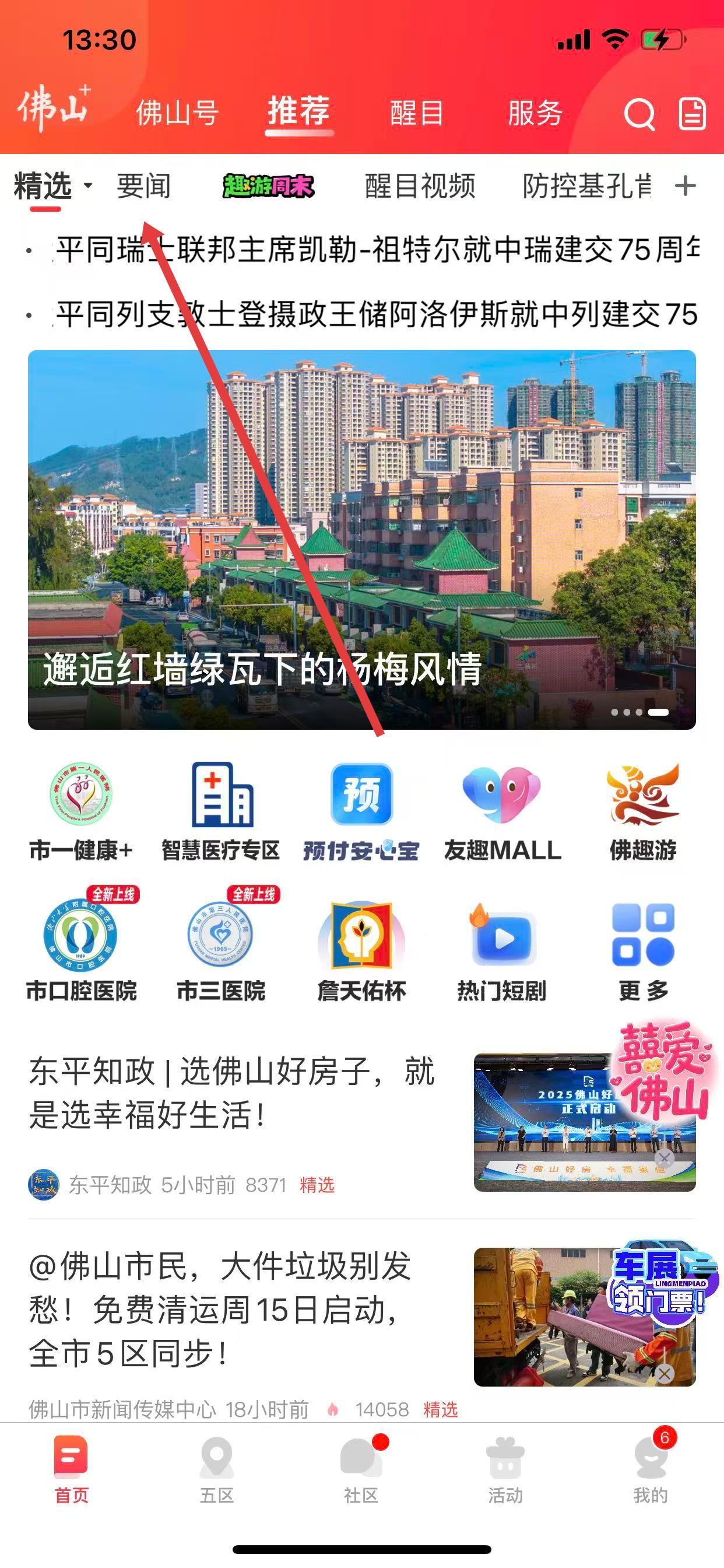 1、打开佛山plus,进入首页后,在顶部导航栏中点击要闻选项。