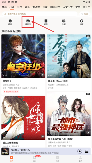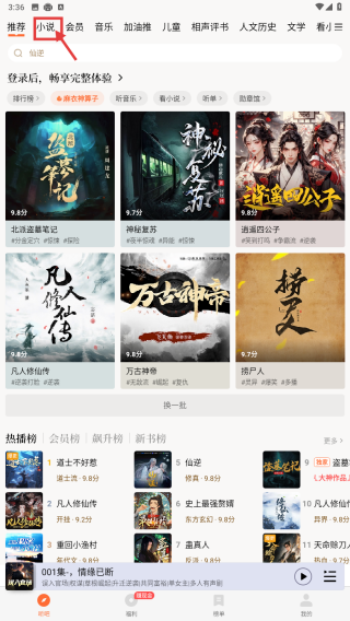 1、打开听书类APP,在首页点击小说分类标签,进入小说相关页面。