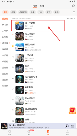 3、在小说榜单页面,找到道士不好惹,点击该小说条目。