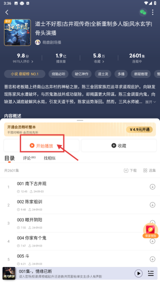 4、进入道士不好惹详情页后,点击“开始播放”按钮,开始听书。