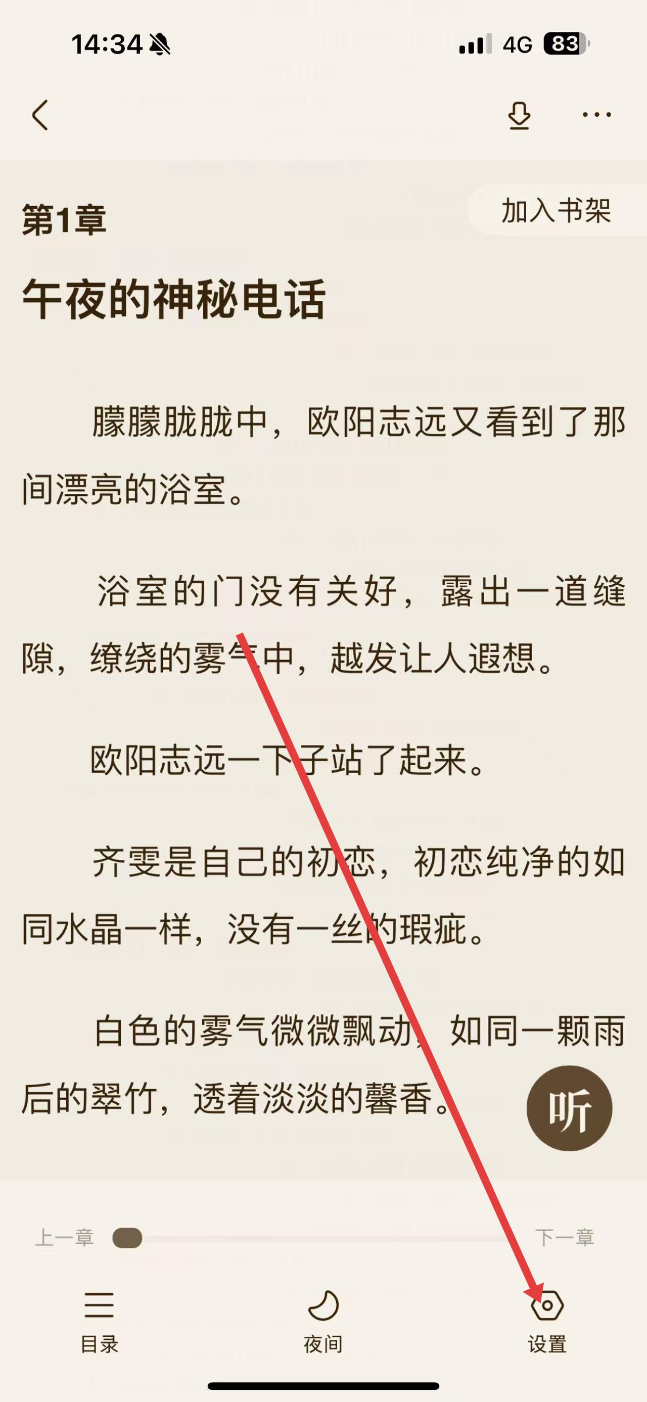 2、在小说阅读界面,点击下方的设置按钮,进入设置选项界面。