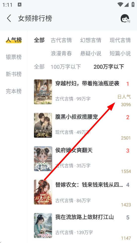 3、在详细榜单页面如女频排行榜,找到目标书籍,查看其对应的日人气等数据,可大致了解阅读量情况。