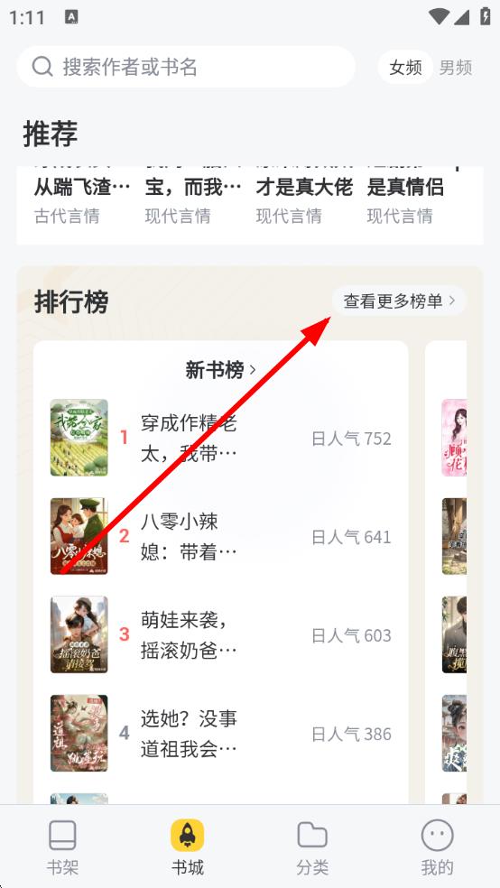 2、在书城界面的排行榜板块,点击查看更多榜单进入详细榜单页面。