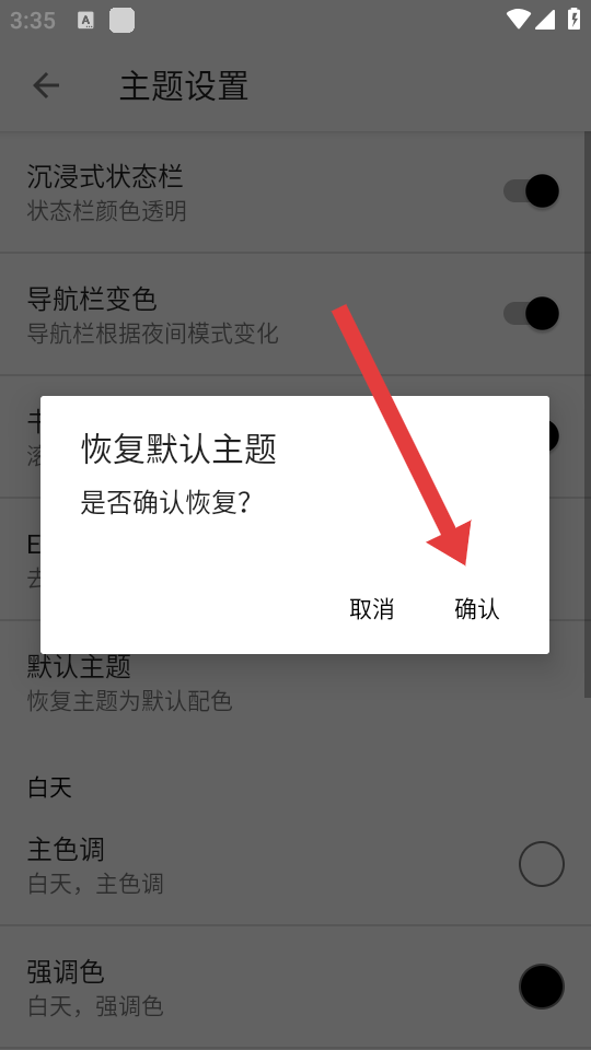 4、在恢复默认主题是否确认恢复的弹窗中,点击确认按钮,即可恢复主题颜色。