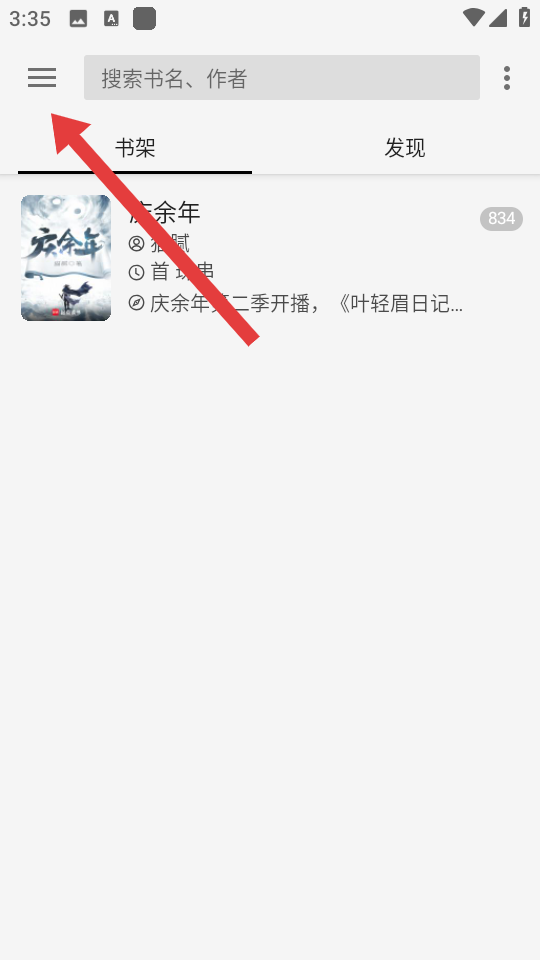 老子搜书怎么恢复主题颜色,按照上面的格式和这四张图片来写,每一张图片对应一个点1、在老子搜书主界面,点击左上角的菜单按钮,展开系统侧边栏。