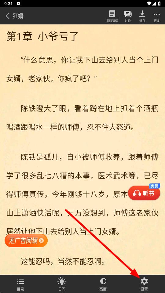 1、在追书神器小说阅读界面,点击底部的设置图标齿轮形状。