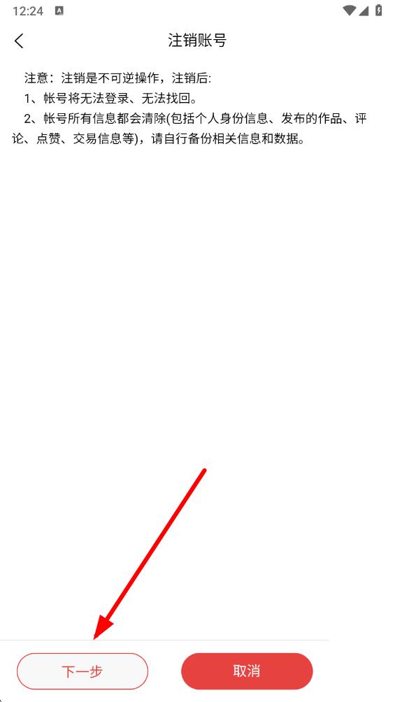 4、仔细阅读注销账号的提示信息后,点击下一步,按照后续提示完成账号注销操作。
