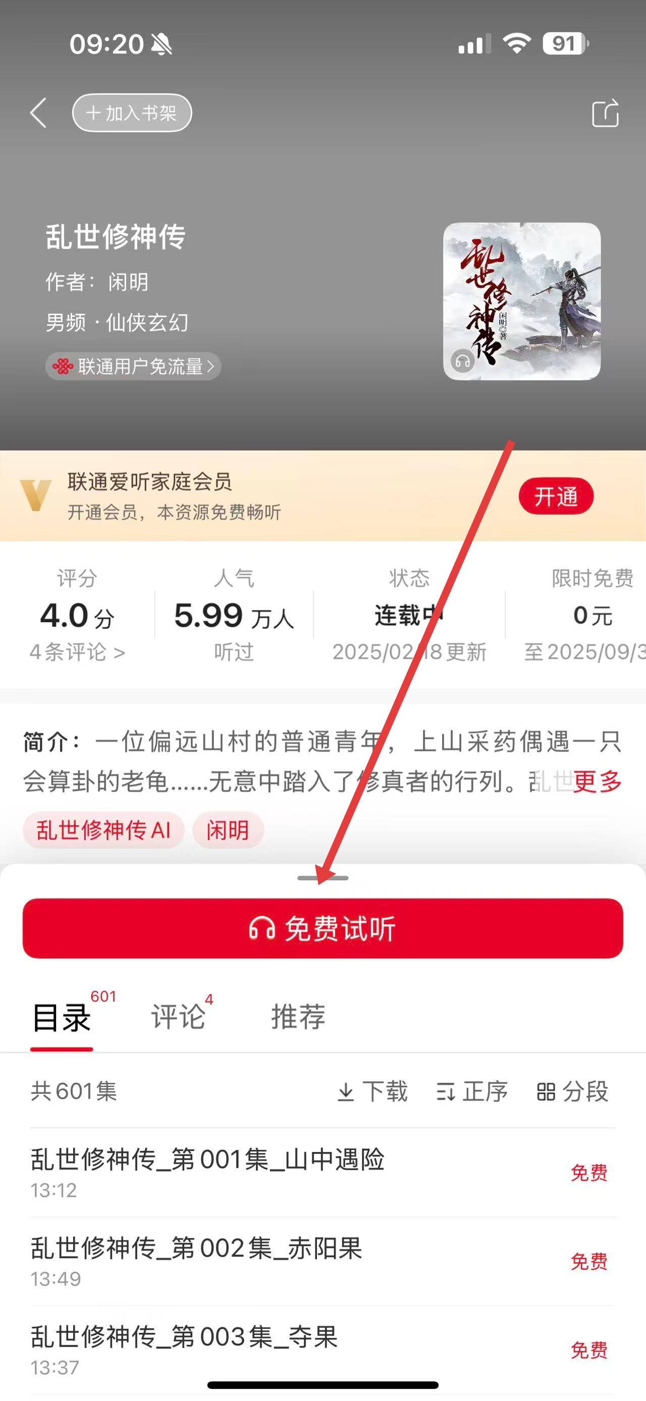 3、进入乱世修神传详情页后,点击下方的免费试听按钮。