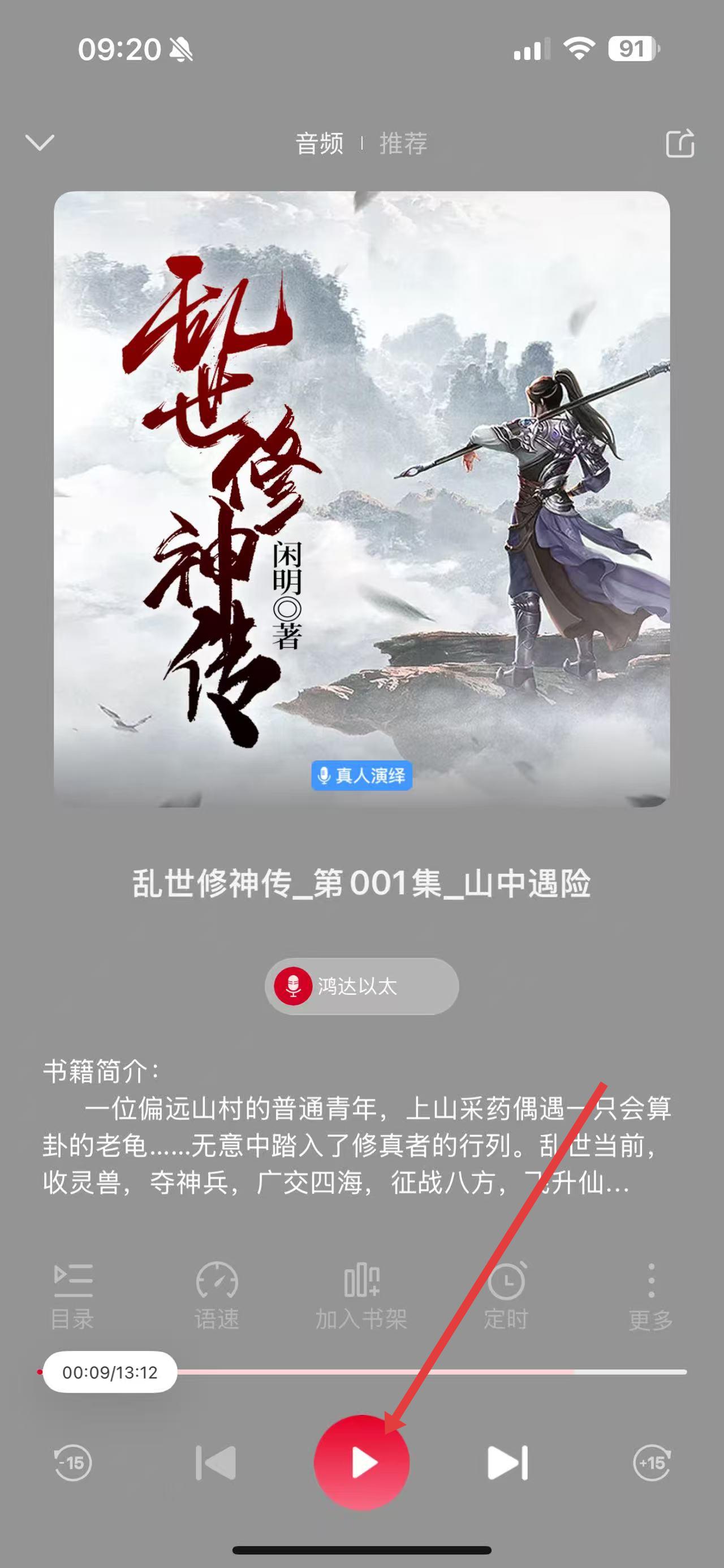 4、进入播放页面,点击播放按钮,即可收听该有声书。