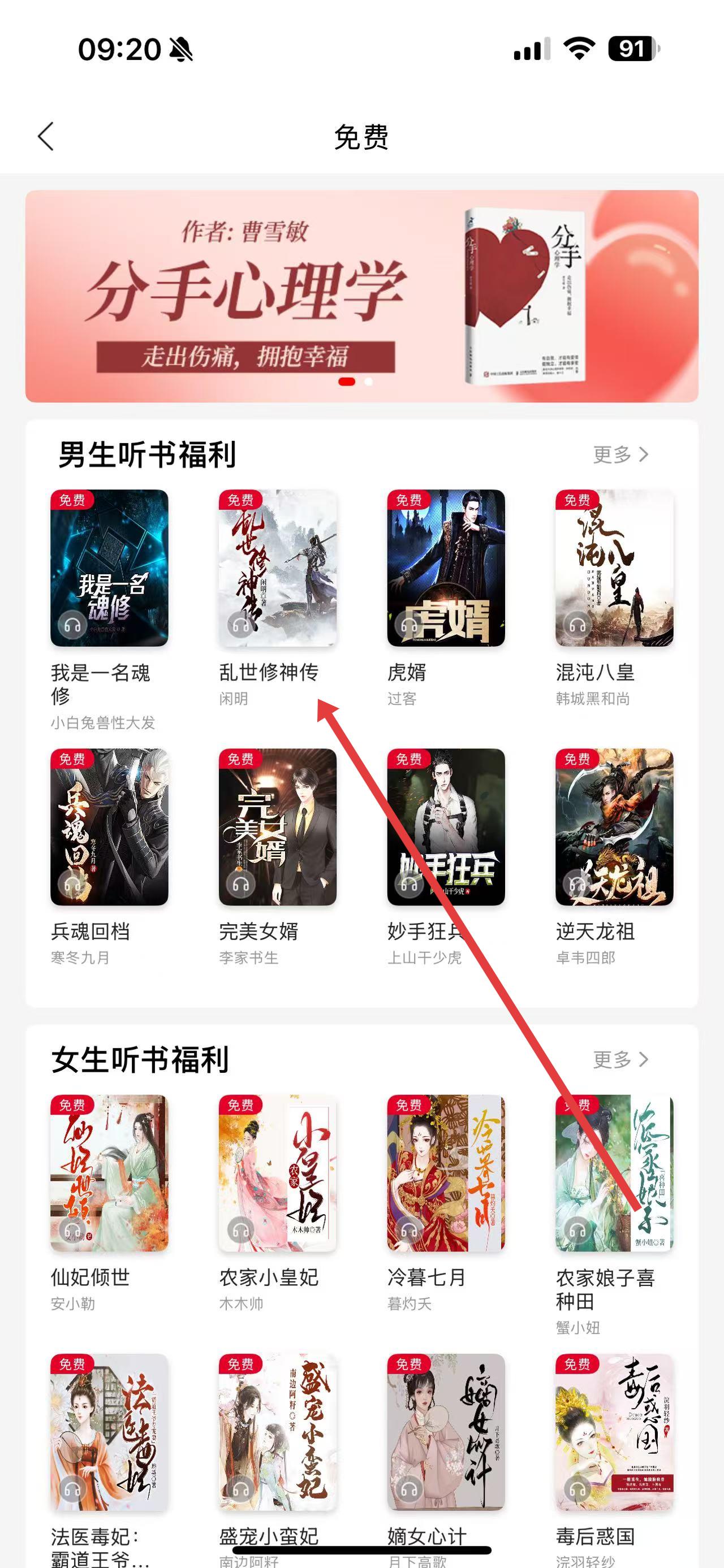2、在免费页面里,找到男生听书福利板块,点击其中的乱世修神传。
